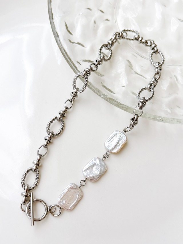 3連のスクエア型の淡水パールがポイント ステンレス製のチェーンとマンテル使用 チョーカータイプで短めです。 マンテルは爪が長くても簡単につけられるアイテム 39cm こちらは長さ変更不可です。 (商品番号No.1)
