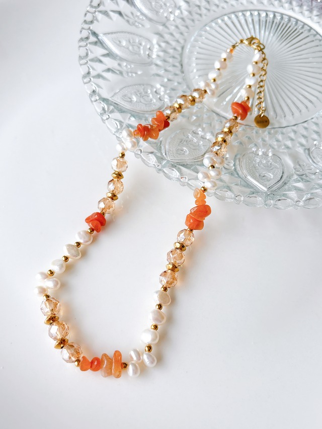 淡水パールとカーネリアンのさざれを合わせた 個性的なネックレスです♡ カーネリアンに似たオレンジガラスも入っています! 完全一点もの!! ・勇気・行動力を高める ・やる気・モチベーションアップ ・成功や目標達成をサポート ・前向きなエネルギーを与える 45+5cm