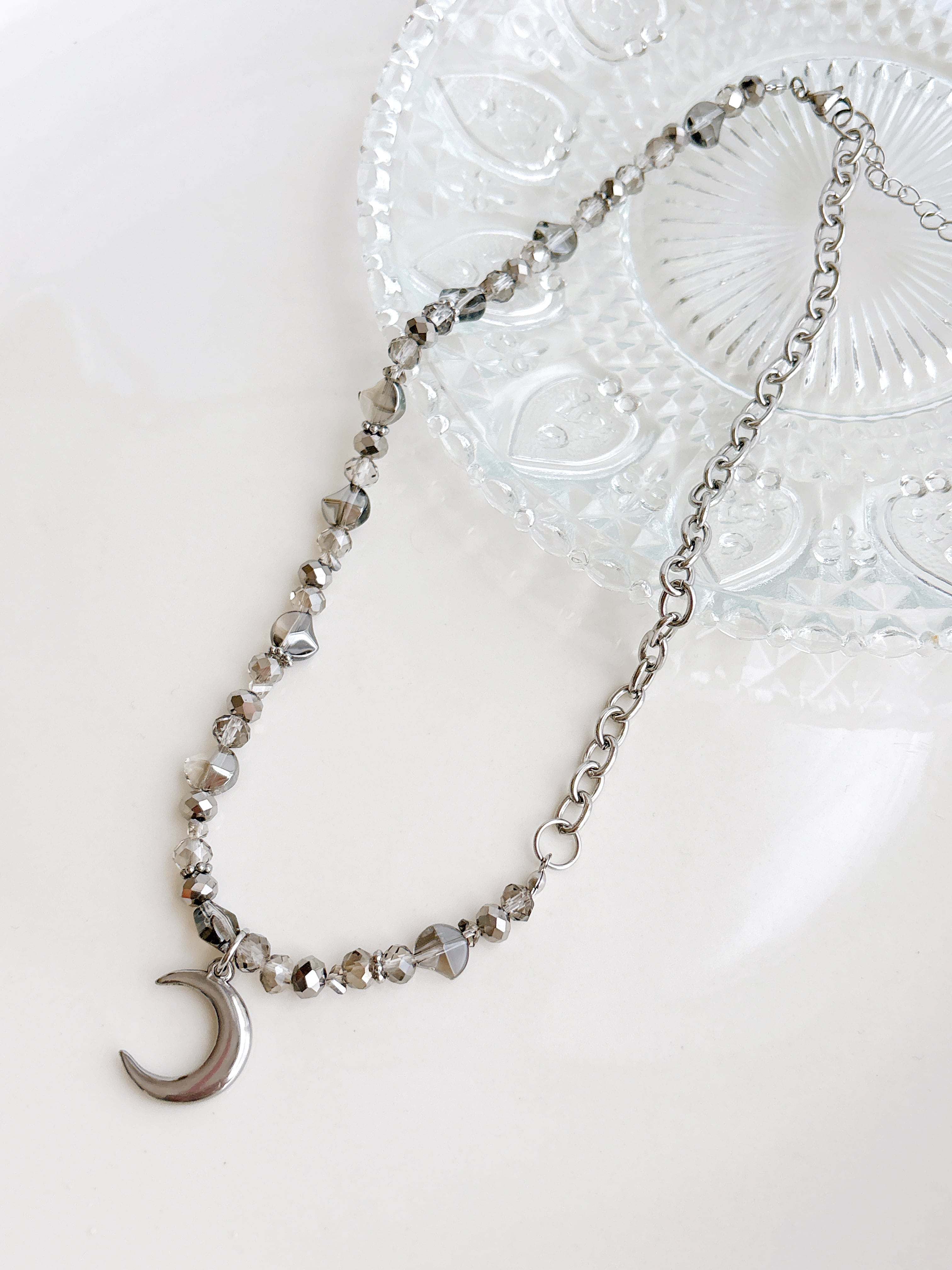 ステンレスのお月様チャームに モノトーンガラスとステンレスチェーンを 合わせました♡ シンプルながらも存在感のあるデザイン❤︎ 45+5cm ステンレス