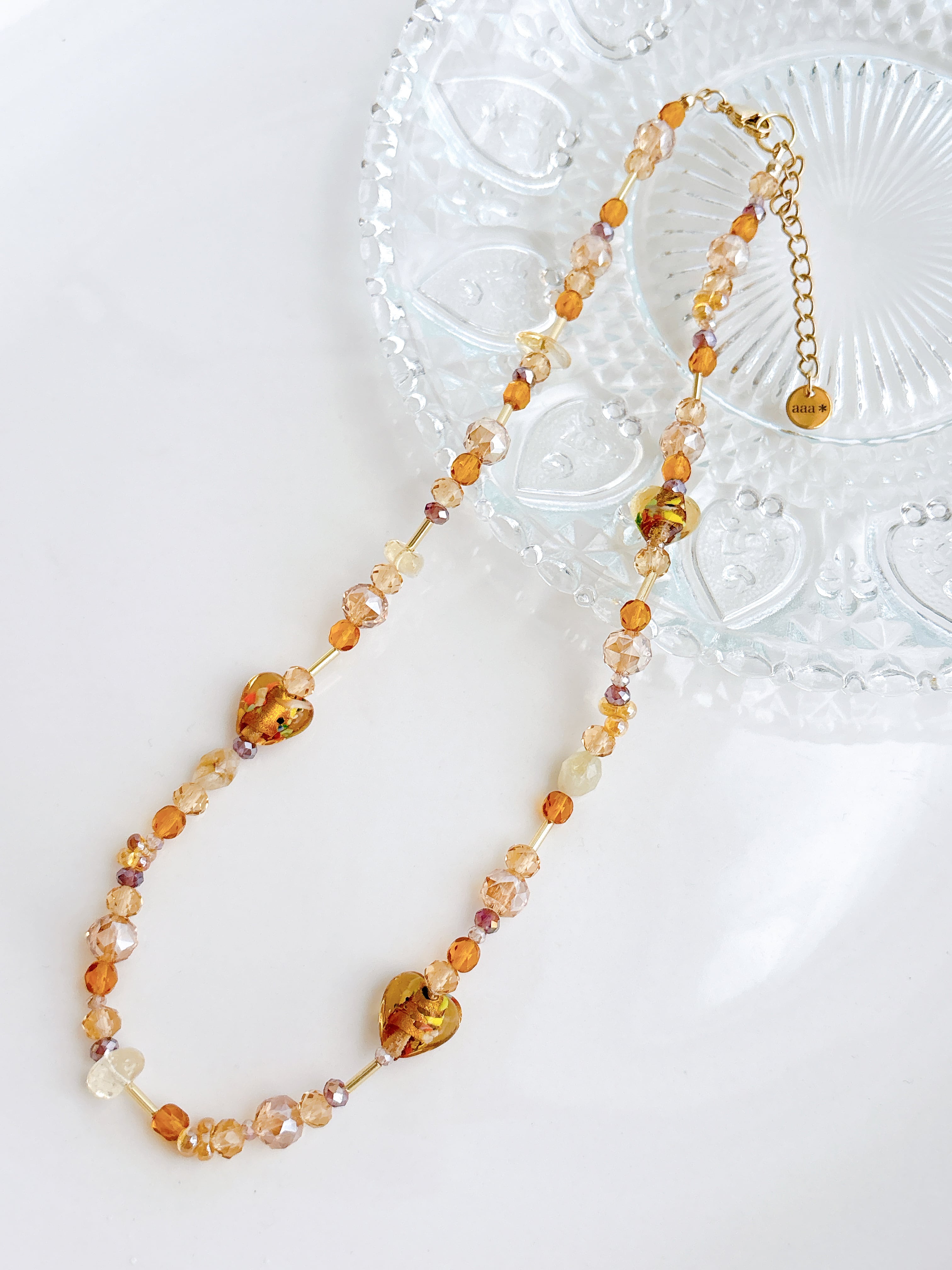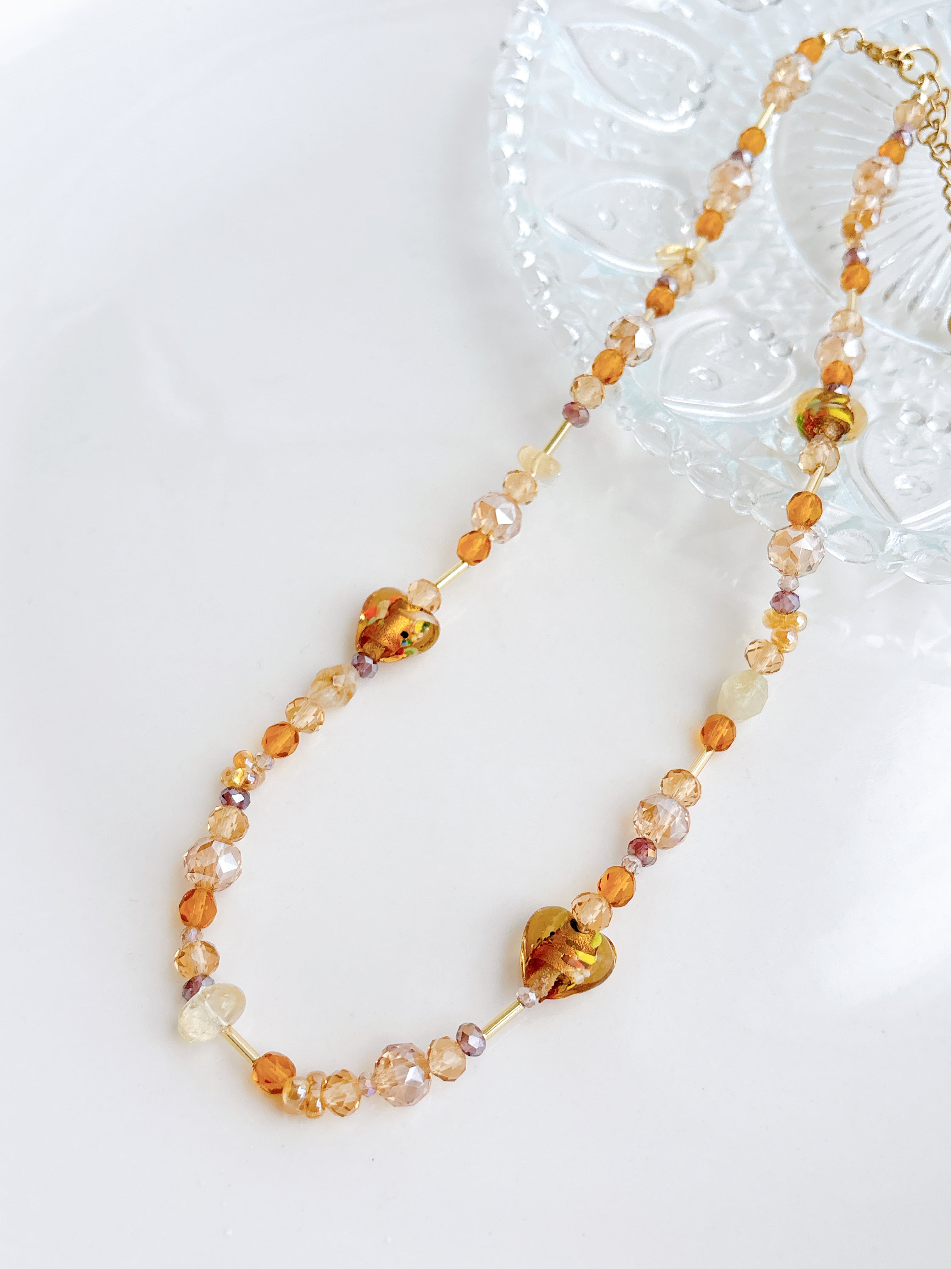 ブラウン系のガラスビーズに ブラウンのとんぼ玉ハートと シトリンを アクセントにつけました♡ 45+5cm ステンレス