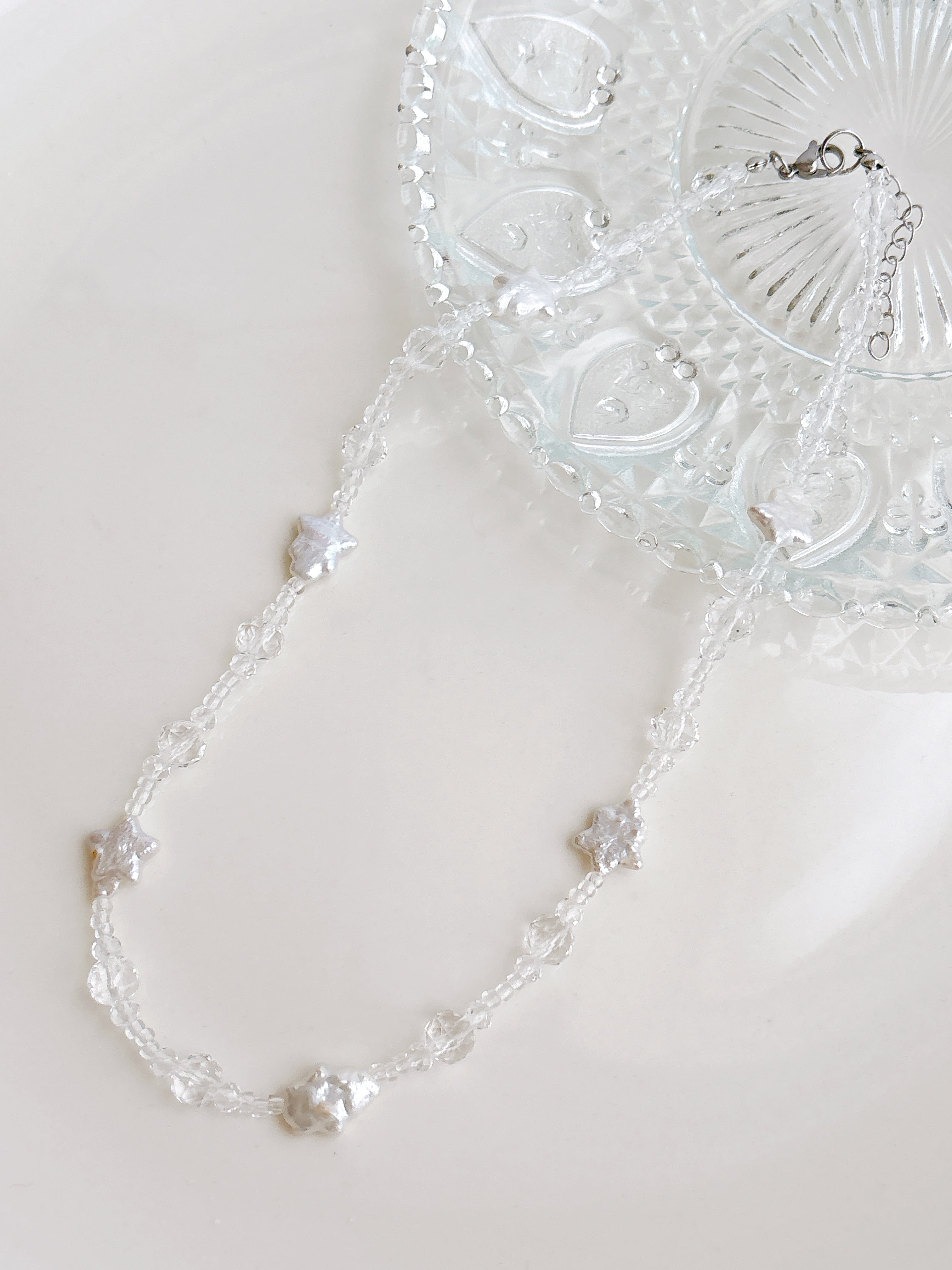 クリアガラスに 歪な形の淡水パールお星様をアクセントにつけました♡ 重ね付けにぴったりのアイテム♡ 合わせやすいですよ♡ 45+5cm
