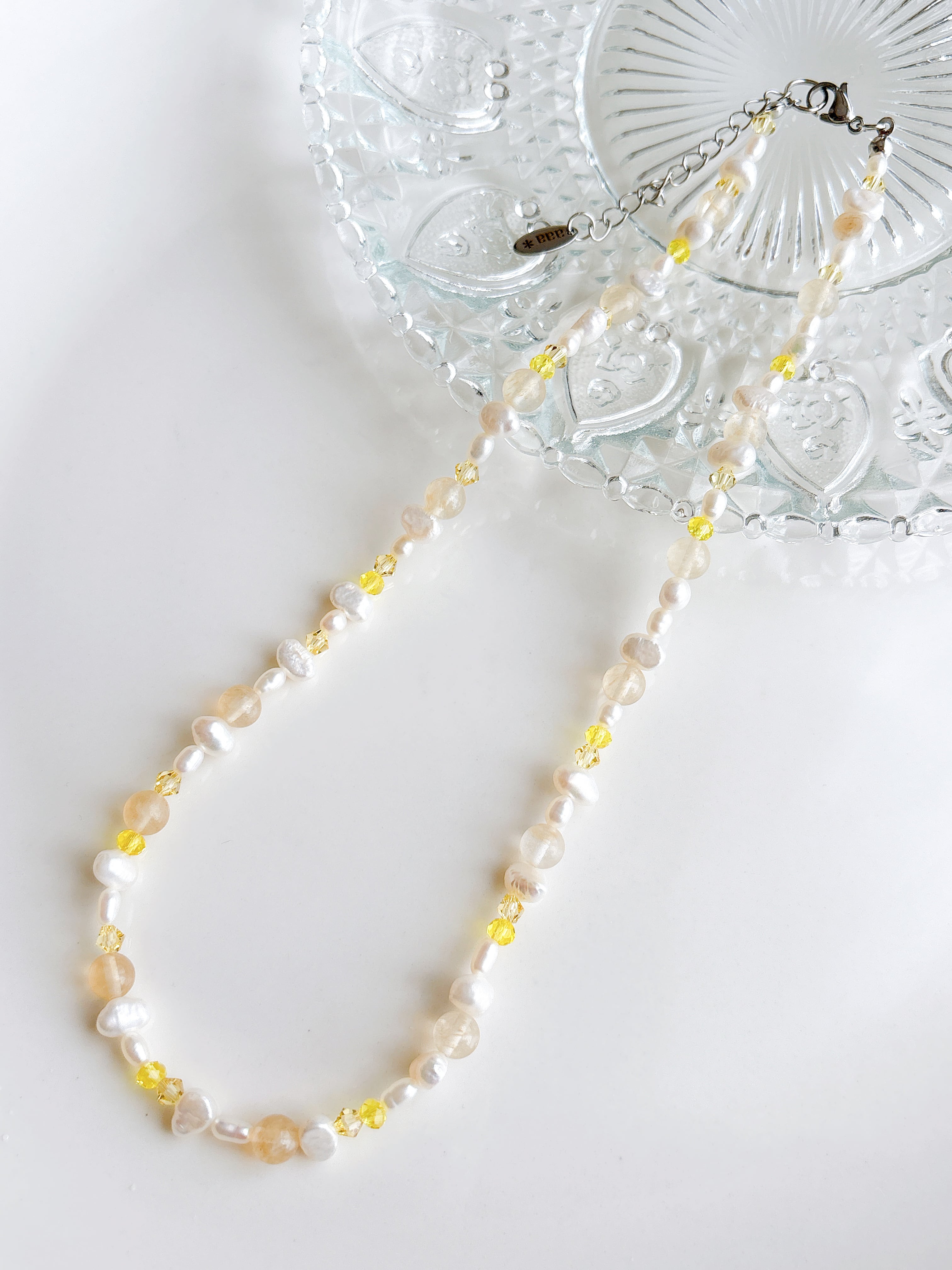 淡水パールとイエローガラスを合わせた 淡いビタミンカラーのネックレス♡ 45+5cm ステンレス