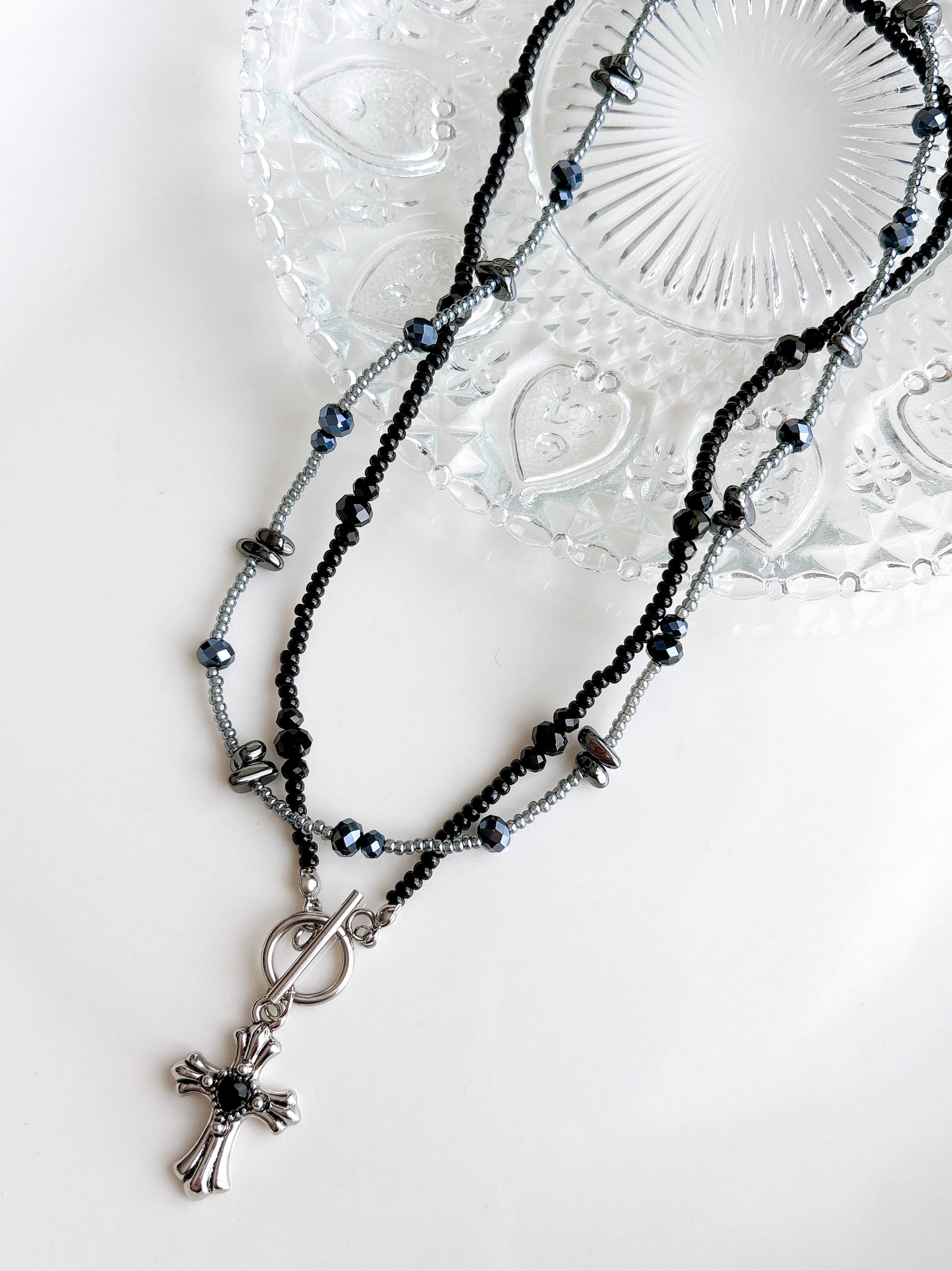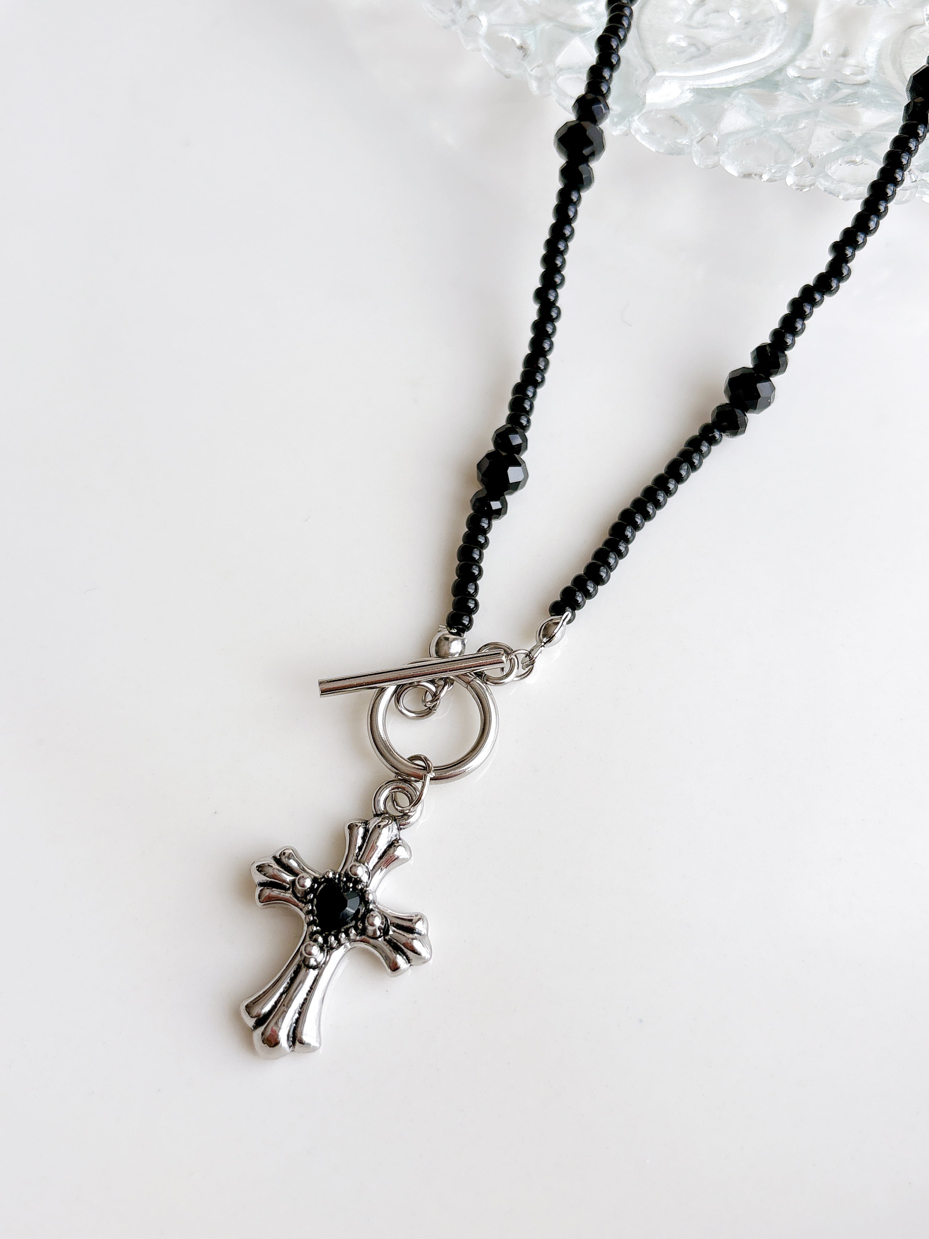 かっこいい!!珍しい!! メンズでもいける!?!? ブラックビーズにかっこいいクロスチャームを つけました♡ ステンレスマンテル 46cm