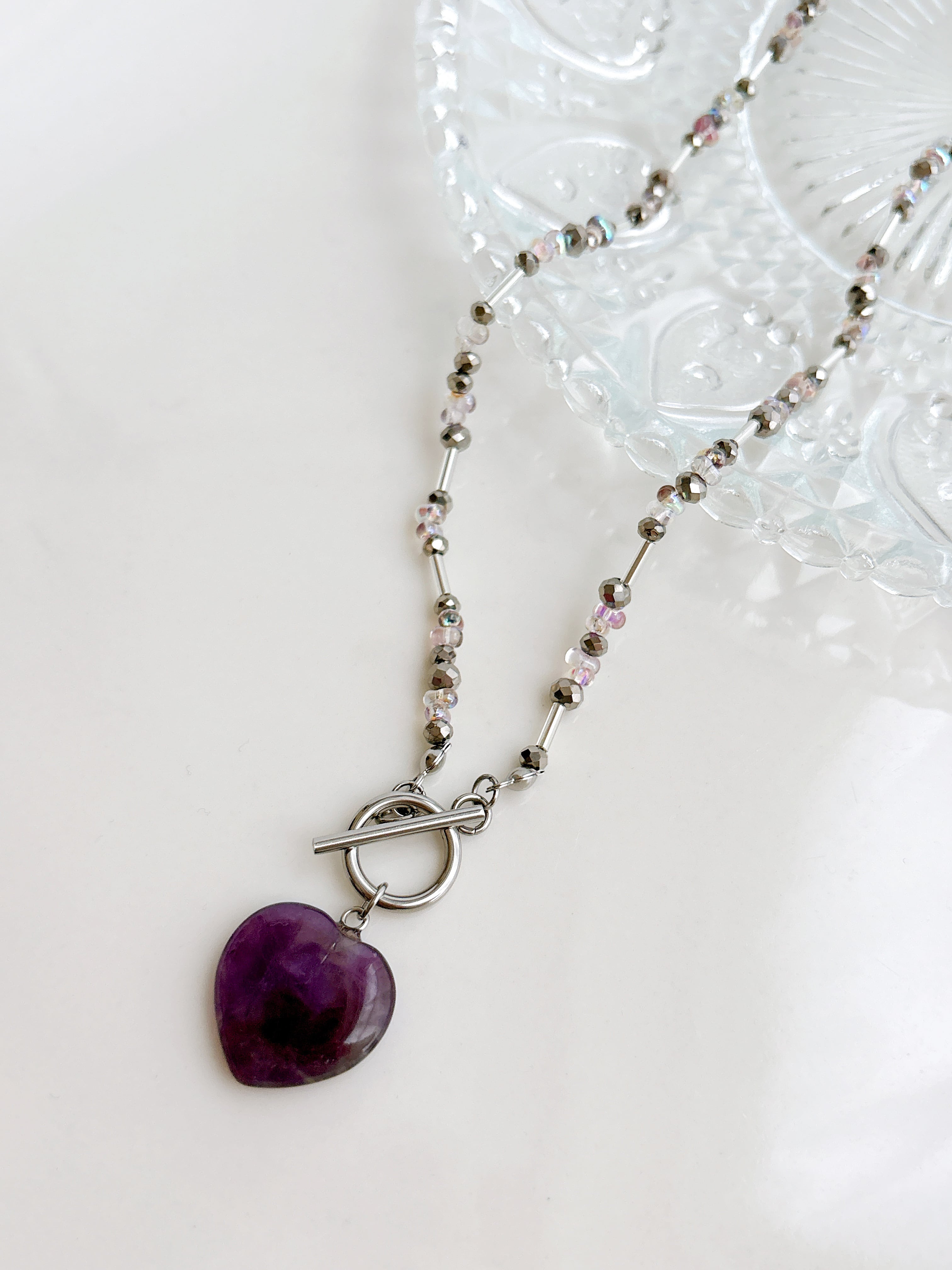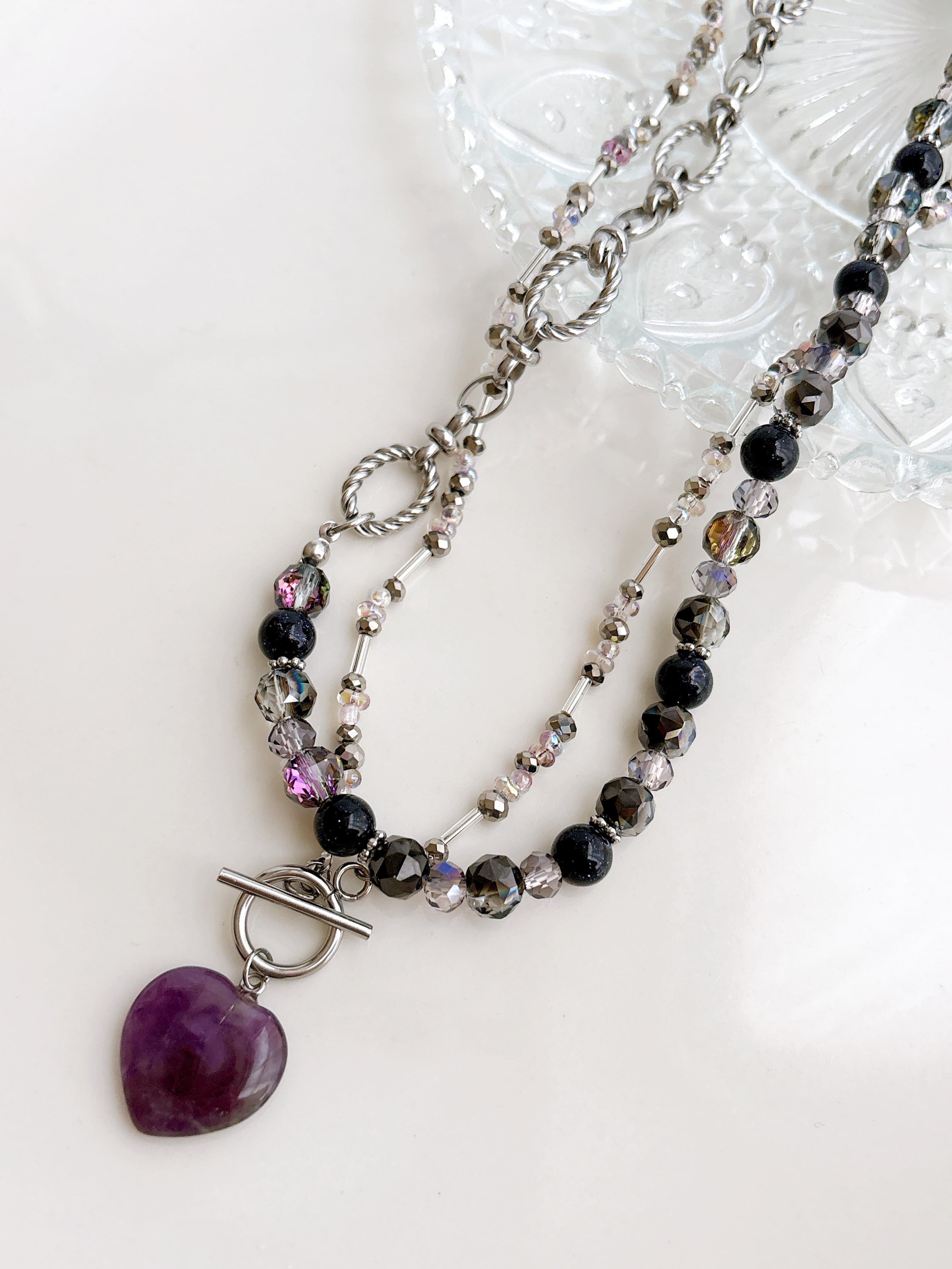 アメジストハートチャームに シルバーとパープルのガラスを合わせました♡ ステンレスマンテル 46cm