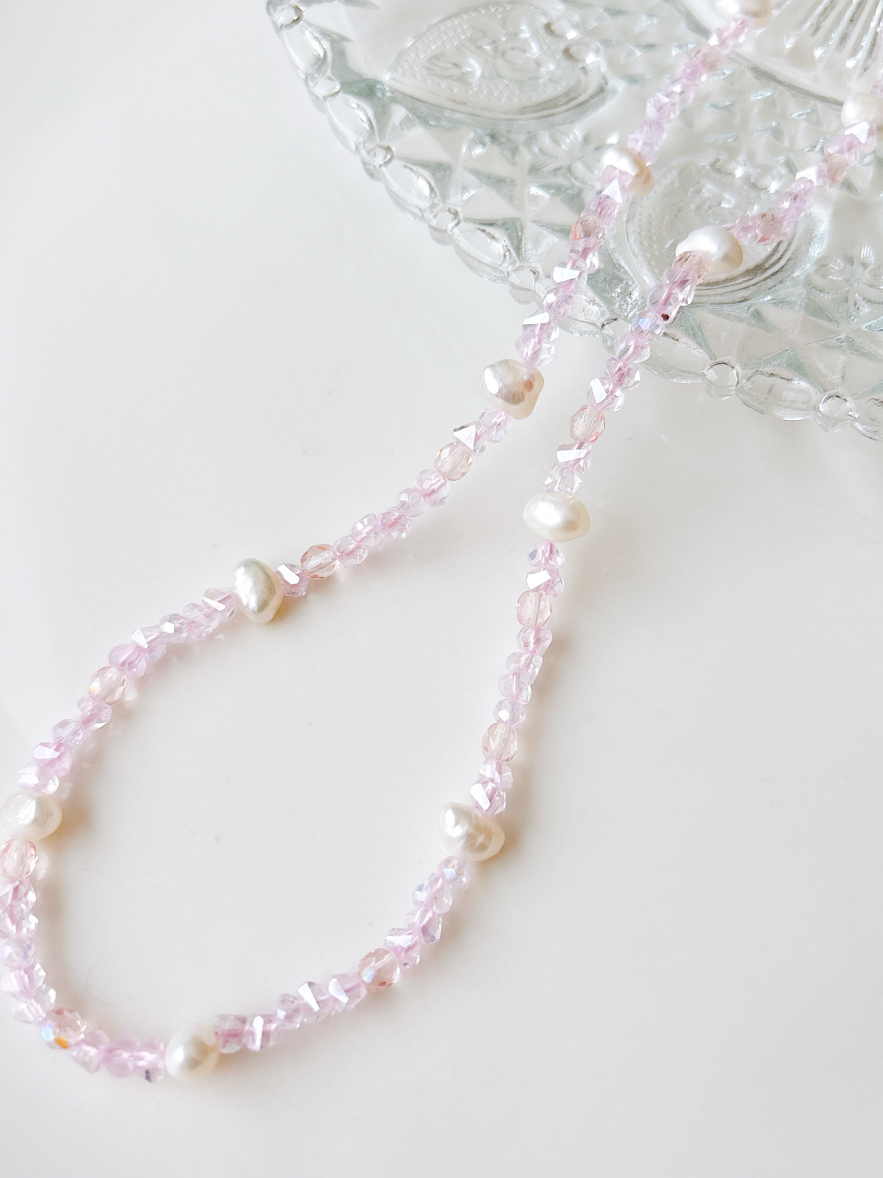 淡いピンクのガラスに 淡水パールをポイントに付けました♡ 肌馴染みの良いネックレスです♡ 45+5cm