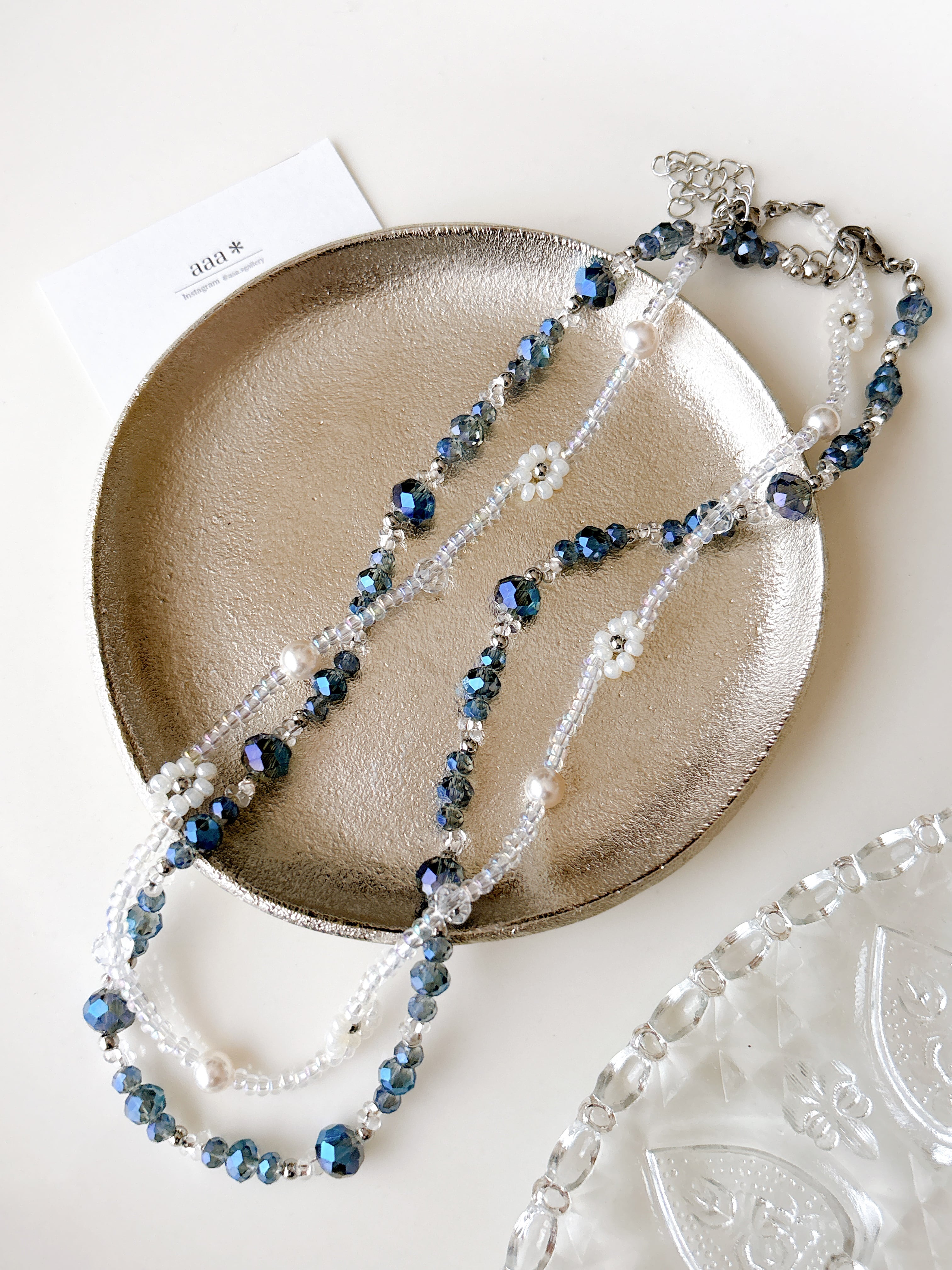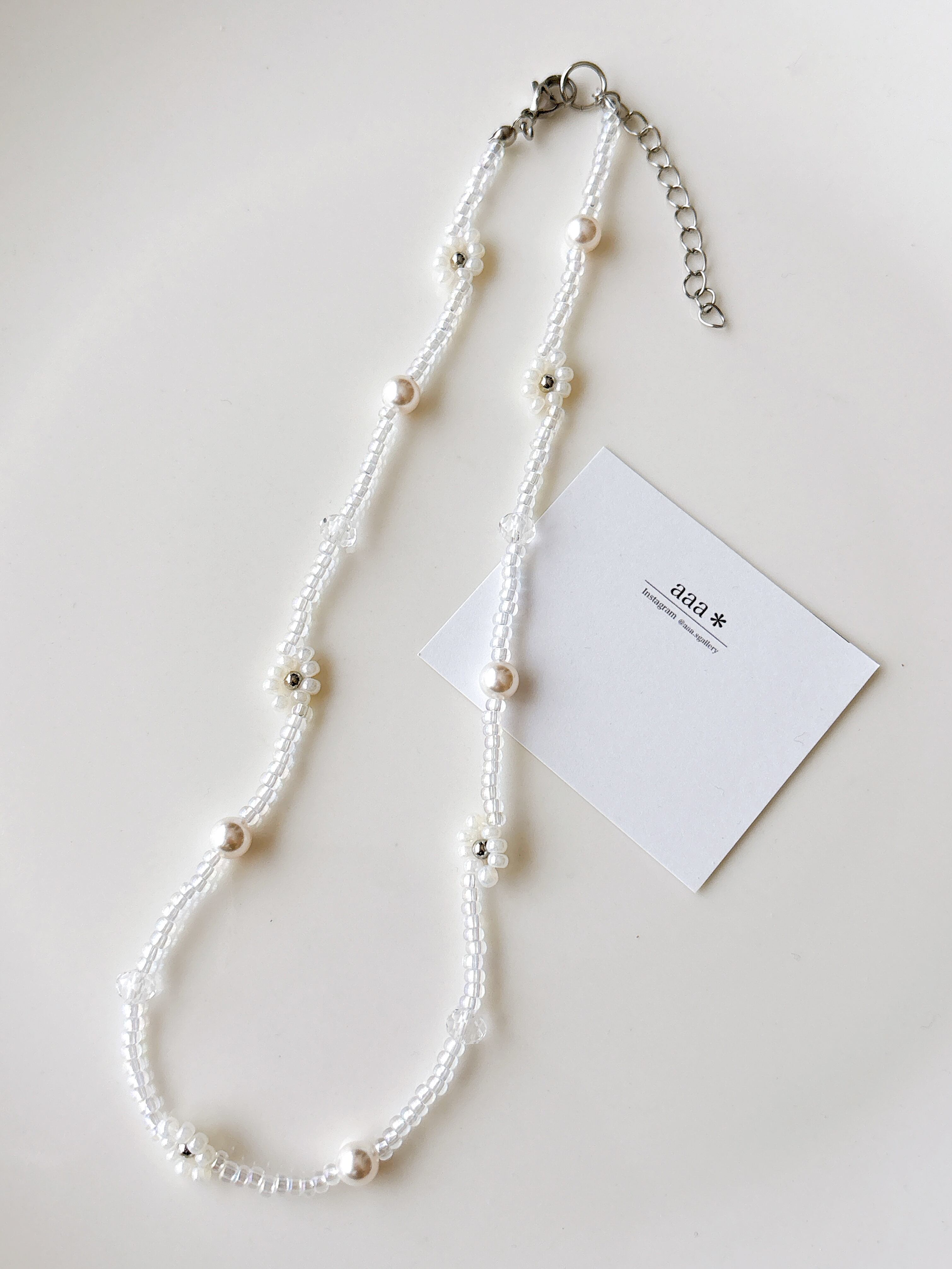 こちらのみベースはオーロラビーズです! ホワイトのお花にクリスタルパールと クリアガラスを合わせました♡ 45+5cm